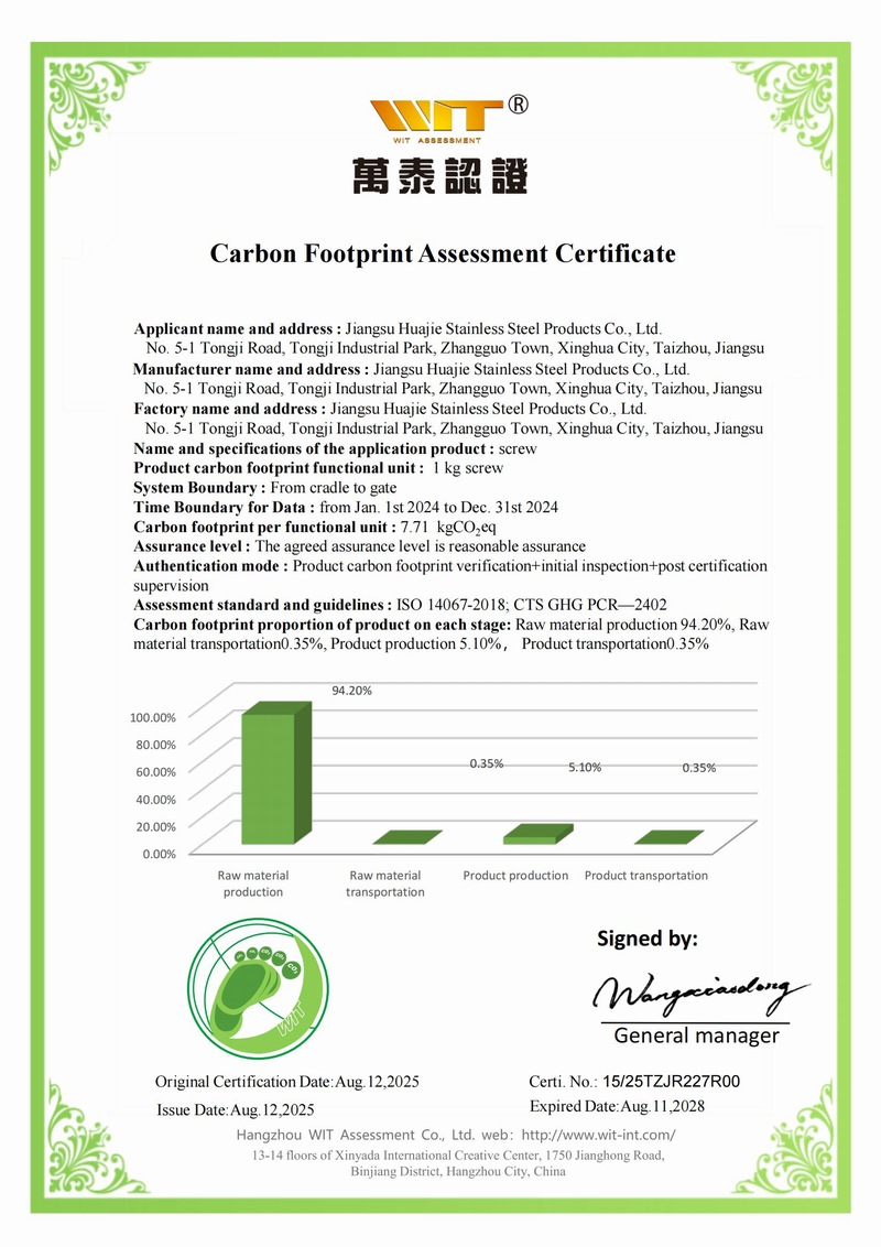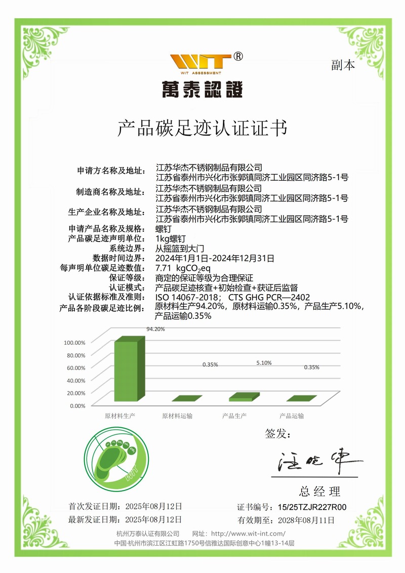 江苏华杰不锈钢制品有限公司-螺钉-碳足迹的公示